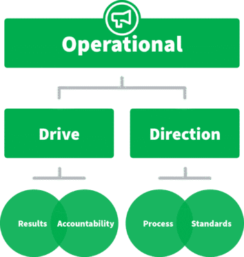 Let’s look at the Operational domain’s dimensions as an example. Every leader has a style for setting expectations and establishing structure (Direction dimension) and for driving results and creating accountability (Drive dimension). A leader’s behavioural approach to driving results could range from realistic to relentless; their methods for creating accountability could range from permissive to demanding. Thus, a leader’s overall Drive might appear realistic and permissive, relentless and demanding, or somewhere in between on that continuum.