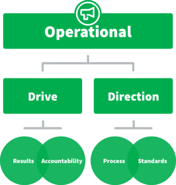 Let’s look at the Operational domain’s dimensions as an example. Every leader has a style for setting expectations and establishing structure (Direction dimension) and for driving results and creating accountability (Drive dimension). A leader’s behavioural approach to driving results could range from realistic to relentless; their methods for creating accountability could range from permissive to demanding. Thus, a leader’s overall Drive might appear realistic and permissive, relentless and demanding, or somewhere in between on that continuum.